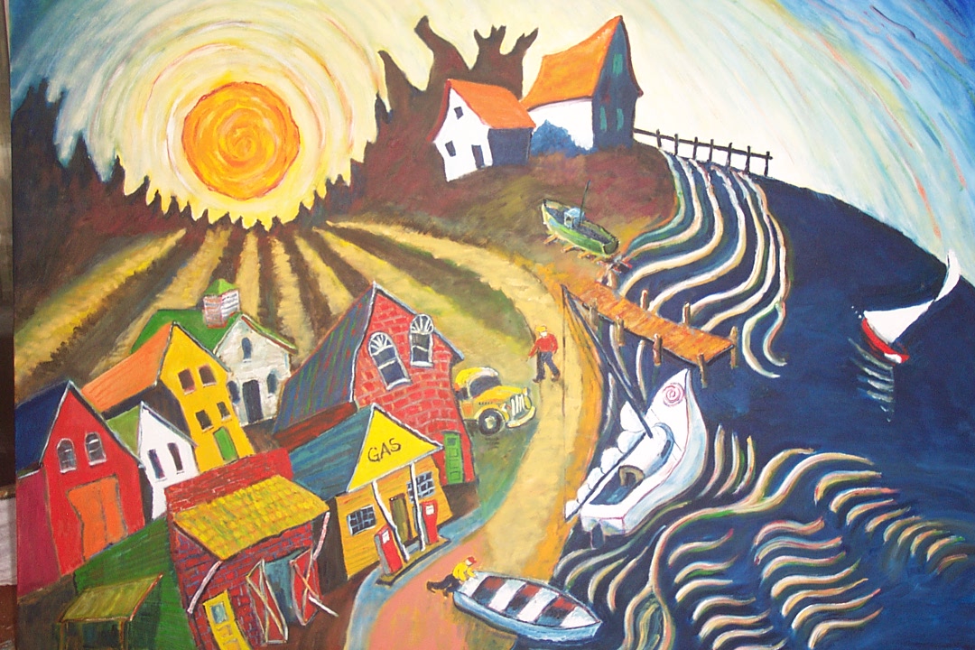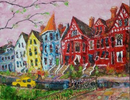Fun it may be, but the Hampton artist is having success as well. Jensen’s work has been displayed at art shows and museums throughout Virginia and is a regular feature in Hampton Roads galleries, such as Blue Skies in Hampton and Riverview in Portsmouth. His paintings have been featured on magazine covers and the Hampton Bay Days poster. And his style is so distinctive that his name is often dropped by casual art lovers when they chance upon his pieces. Jensen’s impressionistic canvasses can be recognized by their undulating landscapes and skylines that vibrate with energy. Vivid colors also make the work stand out, yet it is his abstract style that makes his paintings truly remarkable. Perhaps even more so because of his background—he is an engineer by trade. Retiring from NASA in 1989, Jensen started his own engineering business. A successful contractor, he invented several solar energy systems and holds seven patents. But it was in art where he found release from the rigid structure of his job. “I’d had enough straight lines,” Jensen says. Nothing rebels more against his engineering roots than his “warped building” series. Even so, his process follows a certain regimen, beginning with a sketch of a building that is fairly accurate. “The next thing I do,” Jensen says, “is doctor it up a little bit, put a few kinks in the walls, give it some life. I’ll draw another round and put some lines in there that give it more strength. Then I’ll paint it…Quite often, then, I move the window up into the roofline.” He pauses to compare an original sketch to a final painting. “I don’t mind that [first] building, but I get a bigger kick out of this building now.”