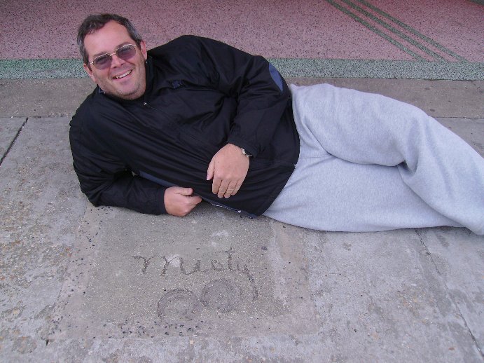 Kurt was a great teacher and the experience was wonderful. It takes 5 full days to build a chair in this manner, but anyone who has the available time and would like to give it a try should give Kurt a call (757-331-4848) or email ([email protected]). You won't regret it. If I can do it, rest assured, anyone can. As long as I was driving out to the Eastern Shore each day to work on my chair, I figured I would also get in some walks. My previous two walks had been out-and-back ventures, where only half the miles counted on my official tally for the Walk Across Virginia. However, Kurt agreed to drive me out and drop me off each day after class so all my miles would count. He's not just a skilled craftsman and a great teacher, but a good Samaritan as well. In the week I spent building my chair, I humped 28 miles from Capeville to Exmore, passing through Cheriton, Eastville, Birdsnest, Weirwood, and Nassawadox along the way. Mostly, the walks were unremarkable. I was merely slogging along the wide shoulder of Highway 13 in the early evening hours, my body already sore from a long day working muscles that hadn't been used in a while. I did get to see some splendid sunsets, but mostly I just kept my head down and knocked out the miles. At least until the last day. On the last day, Kurt dropped me off in Exmore for what was to be my longest walk of the week, a 9-mile jaunt to Weirwood. It had been a wet day but the rain had let up shortly before he dropped me off. Even so, I wore my poncho and a safety vest and brought along a flashlight since dusk was upon me before I started. Kurt dropped me off at a restaurant that was closed for the night and after he drove off I went around the back to relieve myself. As I started walking down the road, I realized I didn't have my flashlight. I called Kurt, figuring I had left it in his truck, but he couldn't find it there. Later, I wouldn't find it in my car either, so I'm guessing I set it down when I stepped behind the restaurant to water their lawn. Guess it serves me right for killing their grass. I had only been hiking for 20-or-so minutes when the rain started up again. No problem, I thought, I've walked in the rain many times before. But then lightning started flashing in the sky and that jolted me into action. I started jogging, my sneakers squish-squish-squishing as I slogged through the downpour. I was miserable for a while then I just told myself, Hey, you can't get any wetter than you already are. I don't know why, but for some reason that made me feel better. Alternately, I would jog for a while then walk a little bit while I caught my breath. Then I'd jog some more. I made good time, but I was soaked through when I got to my car, which was parked at a gas station that was, thankfully, also closed for the night. The rain had temporarily let up, so I grabbed the change of clothes I keep in Ziploc bags in my ruck sack and stepped behind my car. There I stripped down to my birthday suit (hey, easy on the catcalls, you!), toweled off, and changed into something dry. On the drive home, I admired my chair, which was seat-belted into the passenger seat. Dawn wanted to be the first one to see it, so she met me at my house and carried my pile of wet laundry while I brought in the chair. After an appropriate amount of "Oohs" and "Ahs," Dawn headed back to her car. But I saw her double over with laughter when she saw something on the road. She picked it up and brought it over to me. "Here," she said, handing me my sodden underwear. "If some kid found these he'd have nightmares for a week." Quite the inglorious end to a glorious week. Oh, well. I may have lost my dignity, but at least I have a cool chair! Intemperant in Temperanceville Every summer, Chincoteague hosts one of the most incredible events in Virginia: the annual "Pony Swim," which was popularized in 1947 by the book Misty of Chincoteague. Spectators have come in the thousands ever since. Last July, Dawn and I drove up to Chincoteague, plopped down at the end of Pony Swim Lane right at the shore's edge, and watched the ponies swim the channel and cavorted in the marsh grass just a few feet from our position. Quite the breathtaking sight. Afterwards, we hiked back to our car, weaving our way through town and visiting a couple of the boutique stores along the way. We were thrilled with our little adventure. But then, days later, I learned about something we'd missed, and that "something" has weighed on me ever since. In the same fashion as the concrete forecourt of Grauman's Chinese Theatre in Hollywood, the Roxy memorialized Chincoteague's biggest celebrity by pressing her footprints�or, hoofprints in this case�into the sidewalk under the theater's marquee. That's right, Misty has her own "Walk of Fame," and somehow Dawn and I had missed it. Today would be the day we rectified that situation. I didn't tell Dawn what we were doing. She knew we were walking the northernmost section of Virginia's Eastern Shore today, but she didn't know about the detour I had planned. I told her we were going up to Chincoteague merely to eat at the restaurant that bore my name�Bill's Seafood. I parked across the street and we wandered up the sidewalk. As we passed beneath the Roxy's marquee, I said, trying to sound surprised but probably coming off smug, "Well, will you look at this!" We each squatted down next to the hoofprints and the scrawled name of Misty to pose for the camera. "You should lie down next to it," Dawn said. "That would be a better picture."