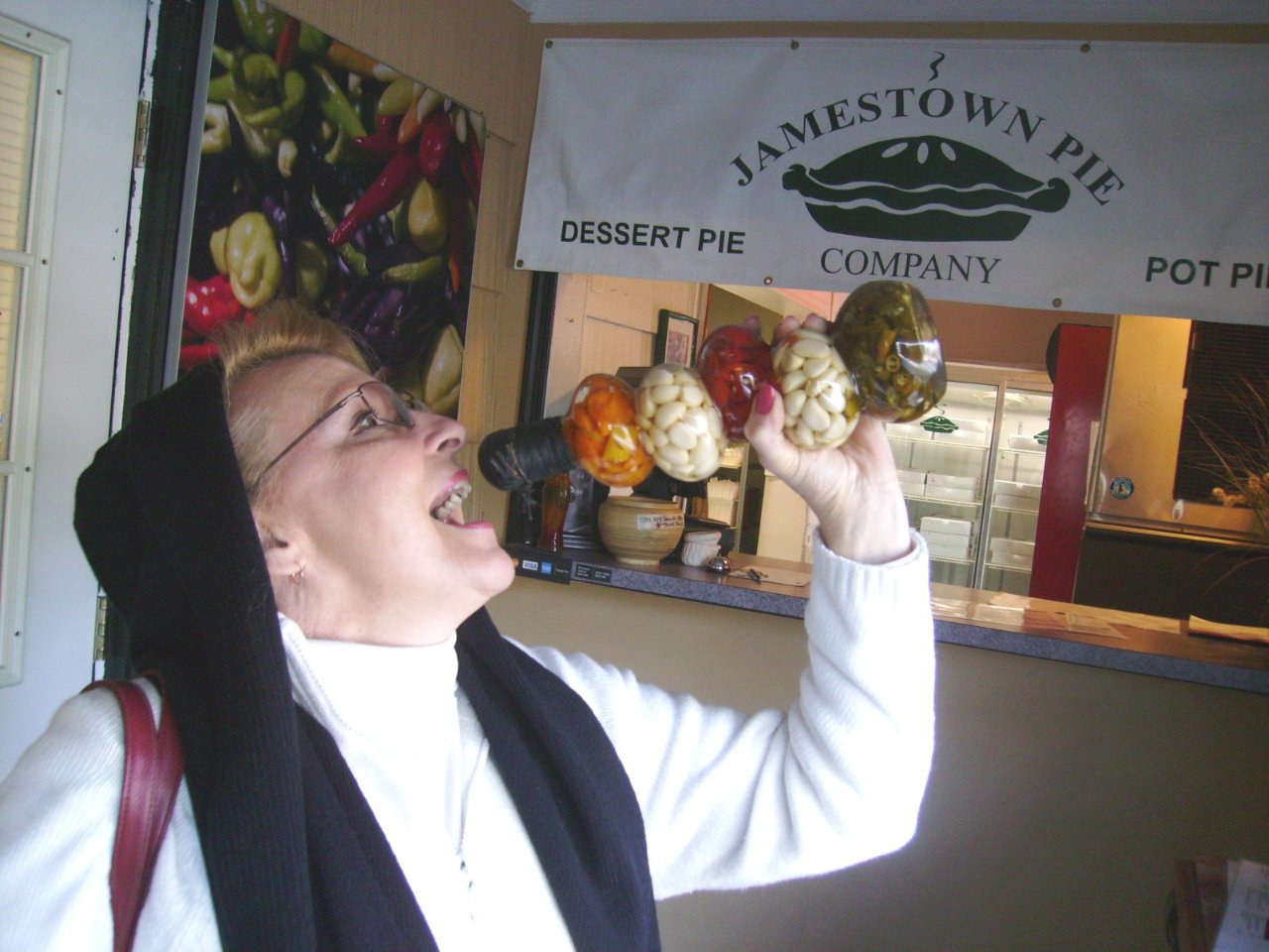 My ego would soon be slapped back down to size. Dawn and I went from the warm and cozy confines of the library auditorium to the stark and windy plains of Jamestown. We were planning a 7-mile walk from the ferry dock site to Colonial Williamsburg. But before we braved the icy wind, first we would stuff our faces at the Jamestown Pie Company, whose motto is "Because round food is good food."