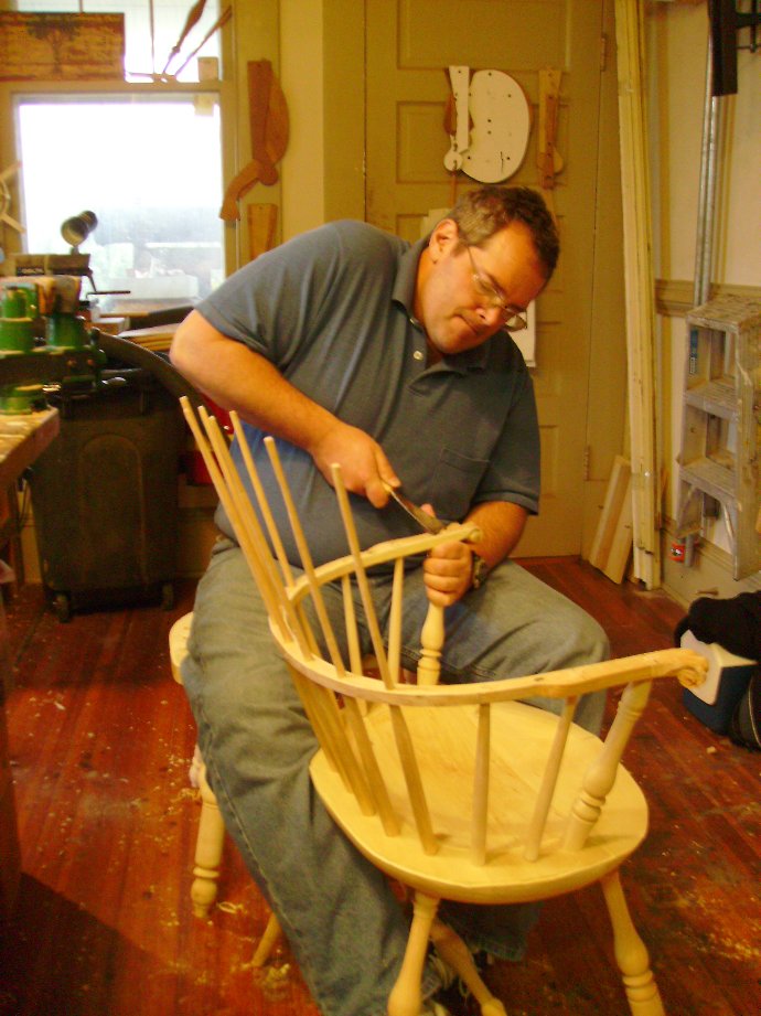 I donned my winter gear, hefted my pack, and trekked northward to Capeville, stopping at a lovely seafood restaurant called Stingrays. I'd walked 5.7 miles and it seemed like a good spot to recharge my batteries. After chowing down on a catfish sandwich, I turned around to walk the 5.7 miles back to my car. But I didn't get too far before stopping. Less than a half-mile from Stingray's, I stopped in at a place called the Windsor House. I'd seen the place when I passed before and made note that in addition to selling local art, antiques, and furniture, they crafted handmade Windsor chairs in a workshop on the premises. Pretty interesting, if you asked me. Pretty interesting even if you didn't ask. But what I hadn't noticed on the first half of my walk was a smaller sign planted in their yard stating that they offered chair-building classes. Now that was VERY interesting. No way I could pass that up.