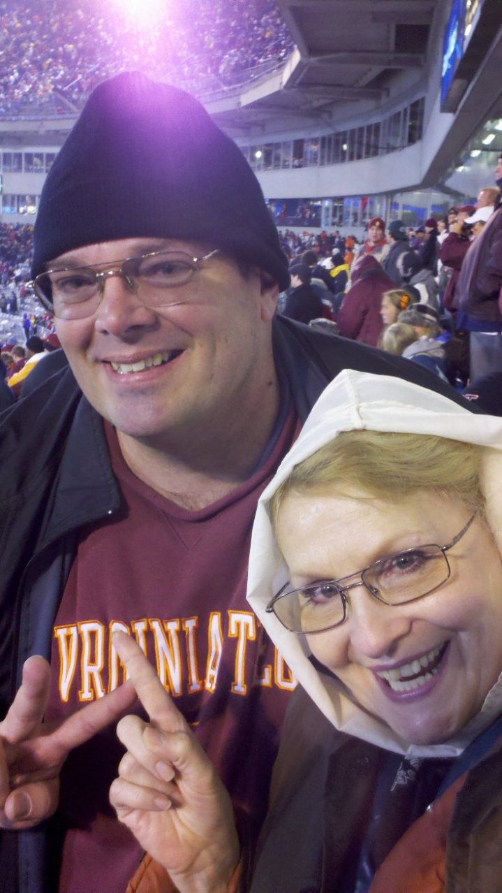 We passed some magical line of demarcation and about a half-hour outside of Charlotte the snow stopped and everything was clear. We parked about six blocks away from the stadium at the NASCAR museum and stopped in at a Buffalo Wild Wings next door. It was pandemonium inside, with hundreds of hungry Hokies filling every seat and barstool and standing in overflow clusters around every table. Someone walked past us with a to-go bag and we decided to take the same route, bringing a bag of vittles back to the car and having out own little tailgate in the parking lot.