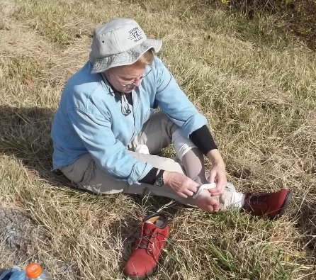 "There are some hay bales across the street," Dawn said. "You could use one of them to step up." I don't know if she was trying to helpful or was just hoping I'd get arrested for petty theft, but I did as she suggested. I hoisted one of the hay bales from an autumn display at the entrance of an apartment complex and toted it across the highway. Dawn doubled over with laughter when I thumped it down beside the sign and the front of my shirt was covered with hay. But it did the trick. And, yes, I carried it back and put the display back together. We were lollygagging, not vandalizing. So, about an hour-and-a-half, we'd barely walked a mile. At this rate it would be midnight before we finished. But the roadside distractions disappeared after that point. From that point on, there wasn't much to see. All of our distractions would be self-supplied, and I was more than up to the task. Earlier today, I had bought a bag of Mary Janes, which a type of toffee candy, and was carrying them in my pocket. Since it was chilly out, I was wearing a black, wool watch cap on my head. "I've got Ma-Hat-Ma-Candy," I told Dawn, enunciating so it sounded like "Mahatma Gandhi." Both of us were so loopy from yesterday's walk that we found this hilarious. At first, anyway. Dawn kind of got tired of it after the 50th repetition. But the biggest hold-up came from Dawn's new boots, which were rubbing her the wrong way. And that's my job! Her feet had fared well in them yesterday, but today the left boot was digging into the top of her foot. She limped along as best she could, but after a few miles had to stop.