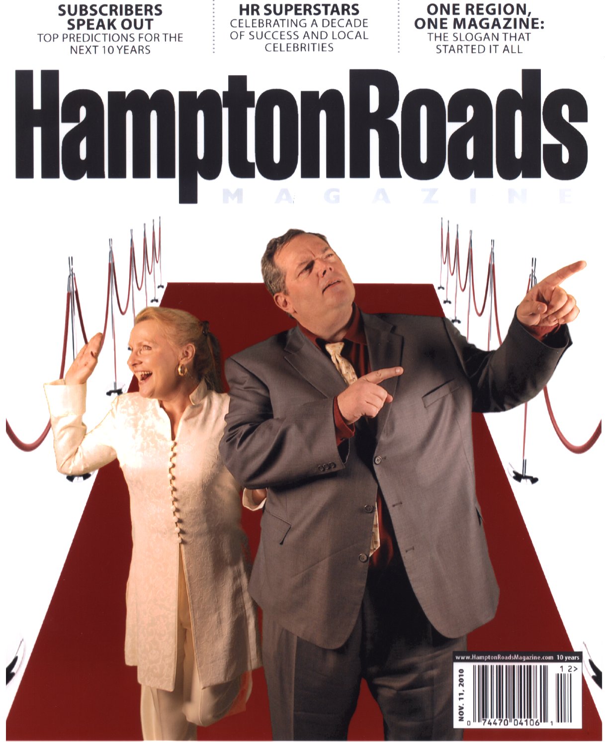 It's a pity I was so worn out because Amherst really was a beautiful little town. It was celebrating its centennial and decorative flags lined the main drag. I noticed several kitschy stores and that all of the parking meters had been painted by local artists. But I was too beat to really investigate. I just snapped a few photos and kept plodding on to the car. The car was parked in a McDonald's parking lot and Dawn was napping inside. I rapped on the window to wake her up, but she didn't budge. The window was cracked, so I called out to her, "Hey, Dawn, wake up!" Still nothing. Finally, I yelled out the one thing I knew would get through to her subconsciousness: "If you don't get up now, I'm keeping all the quarts for myself. NO SOUP FOR YOU!" Works every time. Rolling Out the Red Carpet This evening, Hampton Roads Magazine celebrated its 10th anniversary and the publisher spared no expenses in throwing a semi-formal gala in downtown Norfolk. The good news for me, since I've been a contributing writer with them nearly from the beginning, is that the publisher sent me a couple of tickets to the swanky event held at Norfolk�s Half Moone Cruise and Celebration Center. And the good news for Dawn is that she knows me. Just in general, I mean, but sure, also because she scored my second ticket. As we approached the Celebration Center�don't you just love the name�we saw a few limos dropping off attendees in tuxes and gowns. I elbowed Dawn, "Glad you convinced me to wear a jacket and tie." "Heck," she said, "I'm just glad you didn't come in a tee shirt and flip flops."