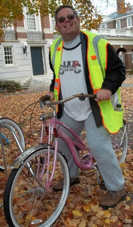 Everything we encountered on campus was just as one might expect to find at a private school in the South. Except for one thing: the pink bikes we kept finding everywhere. Many of them were parked in bike racks at building entrances, but just as many lay haphazardly in the grass or on the dirt paths at the edge of campus. Dawn and I figured they were assigned to various students and faculty, but when we saw two of them lying next to a sidewalk like losing lottery tickets, we couldn�t help ourselves. A cool breeze, rolling hills, unguarded pink bicycles, and a big, sweaty man loose on an all-girls� campus...it was time to make a scene. I grabbed a bike and discovered its tires were flat, explaining why it had been tossed aside. Even so, I hopped on and rode it down the sidewalk, looking something like a trained bear in a circus sideshow. After recovering from a fit of laughter, Dawn grabbed the other bike. This one had broken handlebars, which made her ride just as precarious as mine.