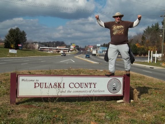 The horses ate it up (hehe), but it turned out chocolate wasn't the only thing we should have worried about. Nuts from the mix got stuck in one of the horse's teeth and he was scrunching up his face as he tried to dislodge them with his tongue. Dawn and I felt bad about doing that to the beautiful creature, but not so much so that we didn't film it. It looked so much like a kid trying to get peanut butter of the top of his mouth, we couldn't help ourselves. With this last diversion out of the way, we marched on for the last couple of miles. By the time we reached my car at Christiansburg's Town Hall, I felt like I'd been beaten with a bag of hammers. I couldn't believe how out of shape I'd gotten. Guess I deserved today's pain. That was the price for slacking off. And Dawn deserved the pain of listening to me. Just because. Back in our hotel, Dawn suggested I use the hot tub down by the pool. I kept arguing about it, saying I didn't really think it would do anything for me, but, eventually, I begrudgingly went along. Only two of the dozen-or-so jets in the tub were functioning, and neither of them was located at a seat. "Great idea," I said. "Just shut up and hold your legs out against the jets." She can be so bossy sometimes. Turns out she can also be right sometimes, as she was in this instance. My legs felt great when I woke up the following morning. We had another mountainous, 9-mile walk planned for tomorrow and this time Dawn and my roles would be reversed. And I would shower her with as much comfort and empathy as she showed me on today's walk. At least, that's my version of events. Don't believe anything she tells you about it. As I mentioned earlier, I'm the only one who can be trusted in matters such as this. Pausing for Photo Ops At the outset of this morning's 9-mile hike, both Dawn and I were feeling great. We'd gotten a good night's sleep and were sauntering down Radford's quite interesting main street, which was filled with distractions aplenty. There was, of course, the typical mix of rustic and majestic buildings one finds in a downtown area. But we were held up by little things that caught our fancy. First, we stopped at a pet store where the owner was wrangling three big dogs and preparing to take them for a walk. We simply had to stop and play with them. Then there was the bike store where Alex was setting some of the bikes out on the sidewalk. One of them was a bike made for two and we asked Alex if we could climb aboard and have him take our picture. Then we saw a billboard beside the road that was barely above street level. The shoulders dropped off into a valley though, so the sign still stood amongst the treetops. How could we pass up a picture-taking opportunity like that? We took turns climbing aboard the catwalk and framing the pics so it appeared as if we'd climbed atop a towering billboard. And just as we were crossing the bridge out of town, a bald eagle glided right over our heads and came to rest on a tree a hundred yards away. So more pics and more gawking. When we finally made it out of town, we were ready to churn out some miles. But first I wanted to stop at the "Welcome to Pulaski" sign. It seemed low enough for me to climb up on to pose for a picture, at least, until I got closer.