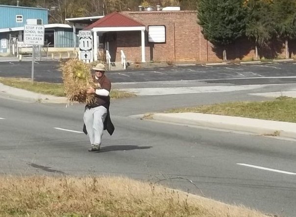 Brie filled us in on school traditions such as the Lantern Procession and The Riding Circle, which is made up of senior students that, on one particular day, get to ride their horses anywhere they want to on campus. She also explained the mystery of the bikes. �The school bought 200 of them,� she said. �They�re not assigned to anyone. People ride them wherever and drop them off anywhere they want. Someone will be riding one of them up a hill and when the pedaling starts to get a little hard, she�ll just step off and leave it right there." At the top of one of the steep hills, we parted ways with Brie as her path headed toward the barns and ours toward the highway. We had to pause to catch our breaths�we�d worn ourselves out trying to keep up with the energetic youngster�and after we could breathe again, we turned onto Business Route 29 and hoofed it along the boring roadside. We trekked through the tiny towns of Falconerville and Monroe and finally came to our hotel in Madison Heights, 7-� miles away. Neither Dawn nor I were conditioned for the hilly hike, and we were both feeling a little bedraggled at the end. But the good news is that the knee held up. It was clicking some throughout the walk and there were a couple of �Whoa!� moments where my knee hyperflexed, but overall I was feeling pretty good about what we'd accomplished. As I sat down and tried to remove my sweatpants, I discovered they were coated with thorns. Dawn had pointed out the thistly plants on the roadside. They looked like dandelions except instead of fluffy tops they were capped with thorny cluster bombs. She�d tried several times to warn me that I was walking too close to them, but each time I yelled out, �Stop with all the Patchouli!� Now, I looked over at Dawn and saw she had a smirk on her face. �You deserved that, too.� Karma. It catches up with you every time. Soup on the Line Yesterday's hike was my first hilly walk in over a month and I'd expected to wake up with wobbly legs this morning. But when I awoke feeling strong, I decided to get in an early morning walk. Didn't matter that the sun hadn't risen yet; I would walk out from our hotel in Madison Heights and Dawn would later pick me up in Elon, 7 miles away. At least, she would if she read the instructions on my note. This was a d�j� vu moment, seeing as the burnt-out husk of a gas station I was walking to was the first-ever place Dawn had dropped me off. It had been a rainy day almost one year ago when I walked from Elon to the outskirts of Lynchburg. And today we were finally filling in the last portions of our southwest passage down from Shenandoah. It was a dark, Saturday morning and there was little to see. I was really just logging miles. But then, about two miles before the finish line, I passed by a Brunswick Stew sale being thrown by the local Ruritan Club. Knowing Dawn's affinity for the stuff, I whipped out my phone and told her what was in her future as long as she picked me up on time. It's always good to bribe her with food. With soup on the line, I figured Dawn would beat me to Elon, and sure enough, she did. We drove back to the Ruritan and asked about the prices. "$7 for a quart," said a man in an apron, "or 3 quarts for $30." Now that is a salesman! Dawn and I sat down and split a quart, since we were planning to go on a 4-mile walk in just a little bit. The soup was so delicious I bought six more quarts: two to go home with Dawn, two to go home with me, one for Dawn's co-worker, Dave, and one for yesterday's cab driver, Lewis, who'd been pleasant and engaging yesterday and who had made plans to pick us up and drop us off for today's walk.