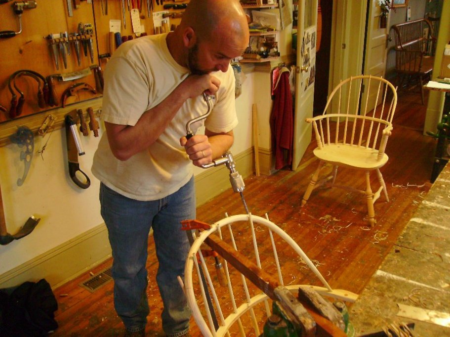 Not only does he have plenty more wood, he doesn't have far to go to get it. The piece he's carving right now came from a red oak in his own yard. Standing on the stoop behind his workshop, he sets a log on the ground and slices it into 16 long strips using an axe. He could be mistaken for a pioneer chopping firewood, except these long strips are destined to become spindles in the back of a handcrafted Windsor chair. He uses a lathe on the legs and the stretchers that go between them, but Lewin carves every other piece of his Windsor chairs using the same tools and techniques as craftsman from Revolutionary times. When Lewin drills holes into the soft wood of the seat, he uses an old-fashioned drill with a hand-cranked arm and a spoon-shaped bit. It looks like he’s performing a lobotomy. Making matters more difficult is the fact that there are no right angles on a Windsor chair. Each hole is oriented in a different direction and turned at a different angle. His workbench, which is dotted with holes from “exuberant drilling,” testifies to the learning curve required to master this technique.